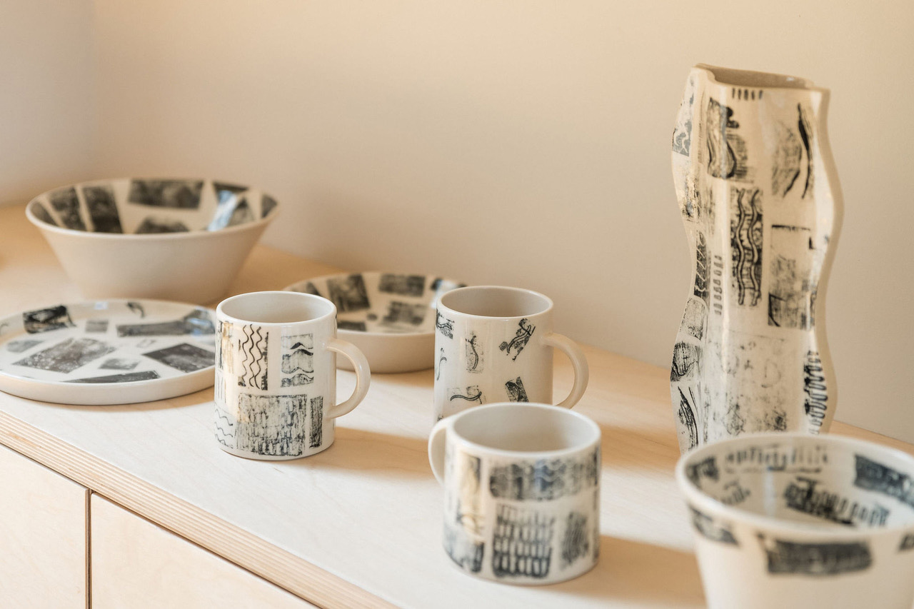 Hannah Bould is a ceramic artist based in South East London, with a background in printmaking. This collection of work includes wheel-thrown and hand-built ceramics, alongside a series of monoprints. With a focus on playful, monotone surface design and mark making, Hannah hopes to build a link between her two practices.