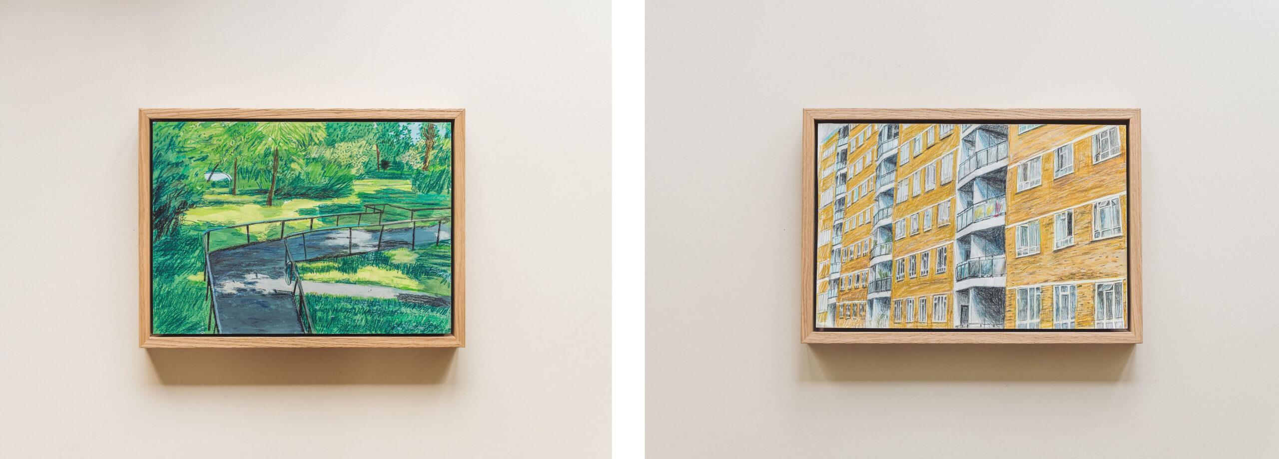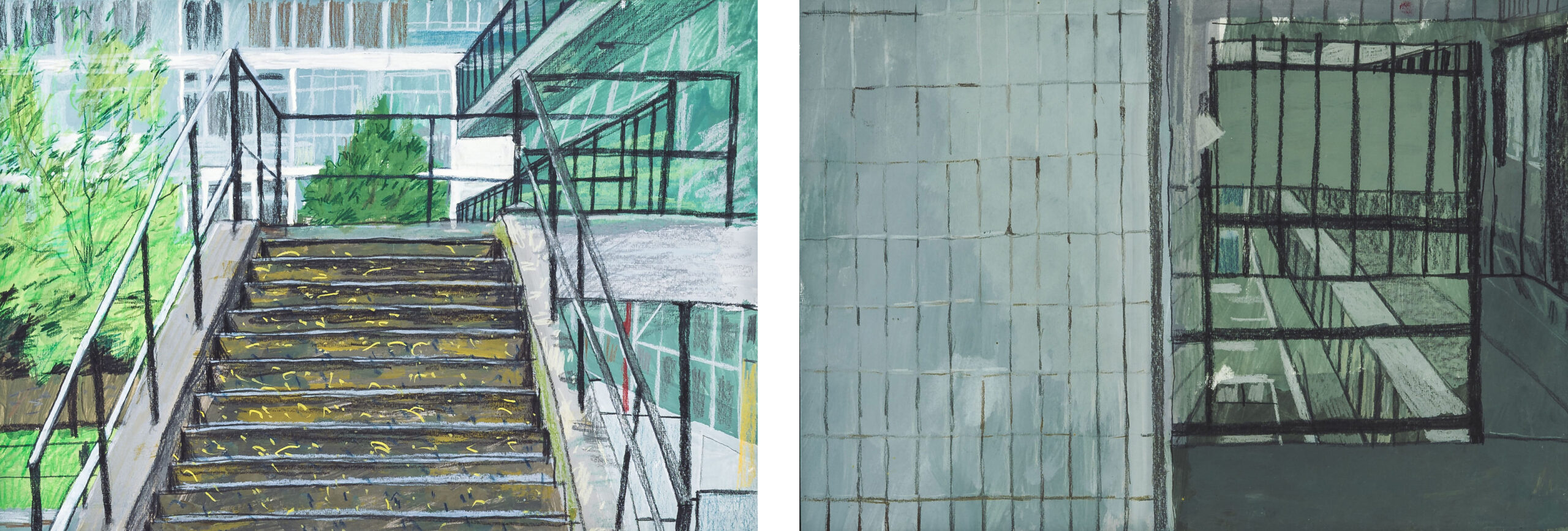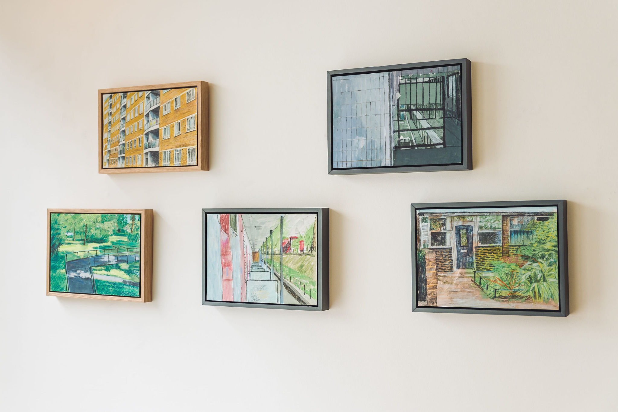 The show focusses on John’s recent work which takes Council Housing as its subject matter. The paintings look closely at these urban spaces—stairwells, corridors, walkways—concentrating on getting close to the details, an intimate look at our built environment: here a low wall, a corner plot, haloed by a single yellow line; or a concrete wall, a little worse for wear, taking up half the frame of an image, the other half a criss-crossed grid of railings looking down onto other corridors, other walkways, other lives. Although these images are unpeopled, devoid of the human figure, they represent the lived experiences of the inhabitants. Behind the rows of windows we see in one of John’s paintings, lives are led. Behind the net curtains TVs flicker, bathroom mirrors steam up, voices are raised, children laugh. All human life is here.