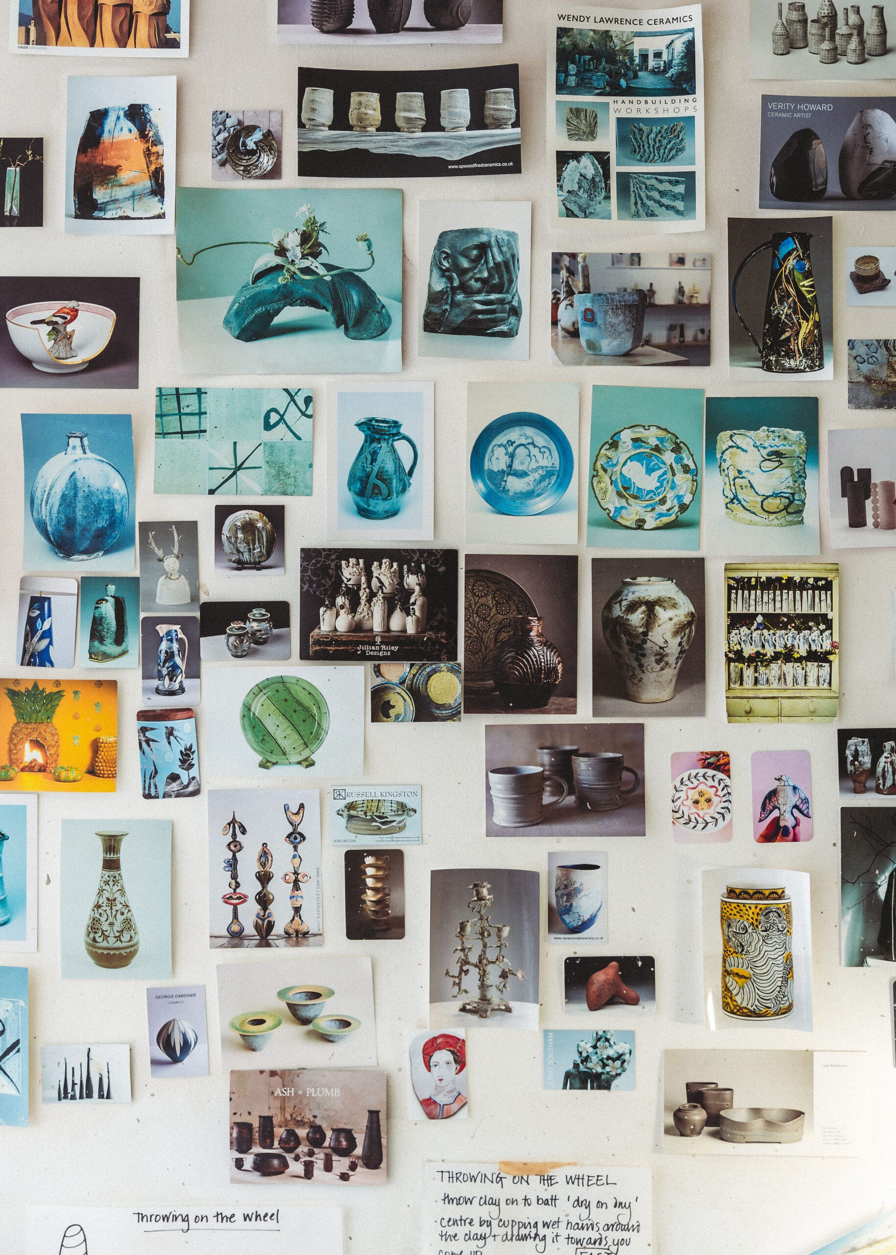 Carol works in her courtyard garden in a tiny converted shed. She rescued the beautiful window frames from a skip and painted them in her favourite green, which she named ‘Potterycrafts’ green as it reminds her of the colour used by the renowned Stoke-on-Trent ceramics suppliers for their kilns and clay bags.