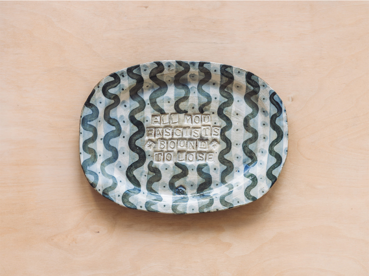 Unique hand-moulded platter ‘All You Fascists Bound To Lose’; a lyric by US folk singer Woody Guthrie. Impressed with letter stamps that have been designed and hand-carved by the artist from clay. Glazed stoneware, white and crank clay, oxides, and slip decoration to front with maker’s impression, and decorative glazed circles around the edge on reverse. Measures 290mm wide by 210mm tall. Adhesive D-ring attached for wall hanging option.