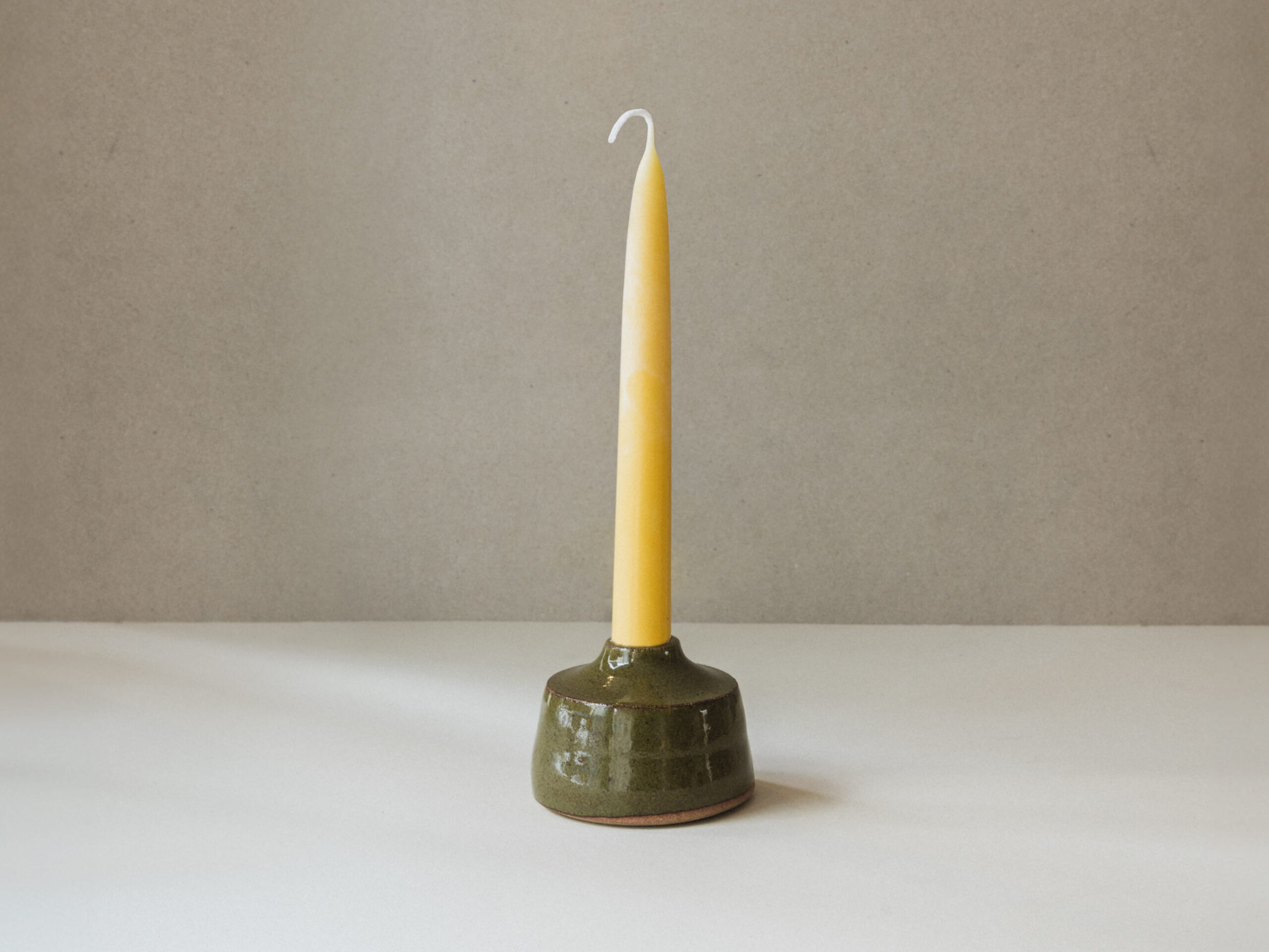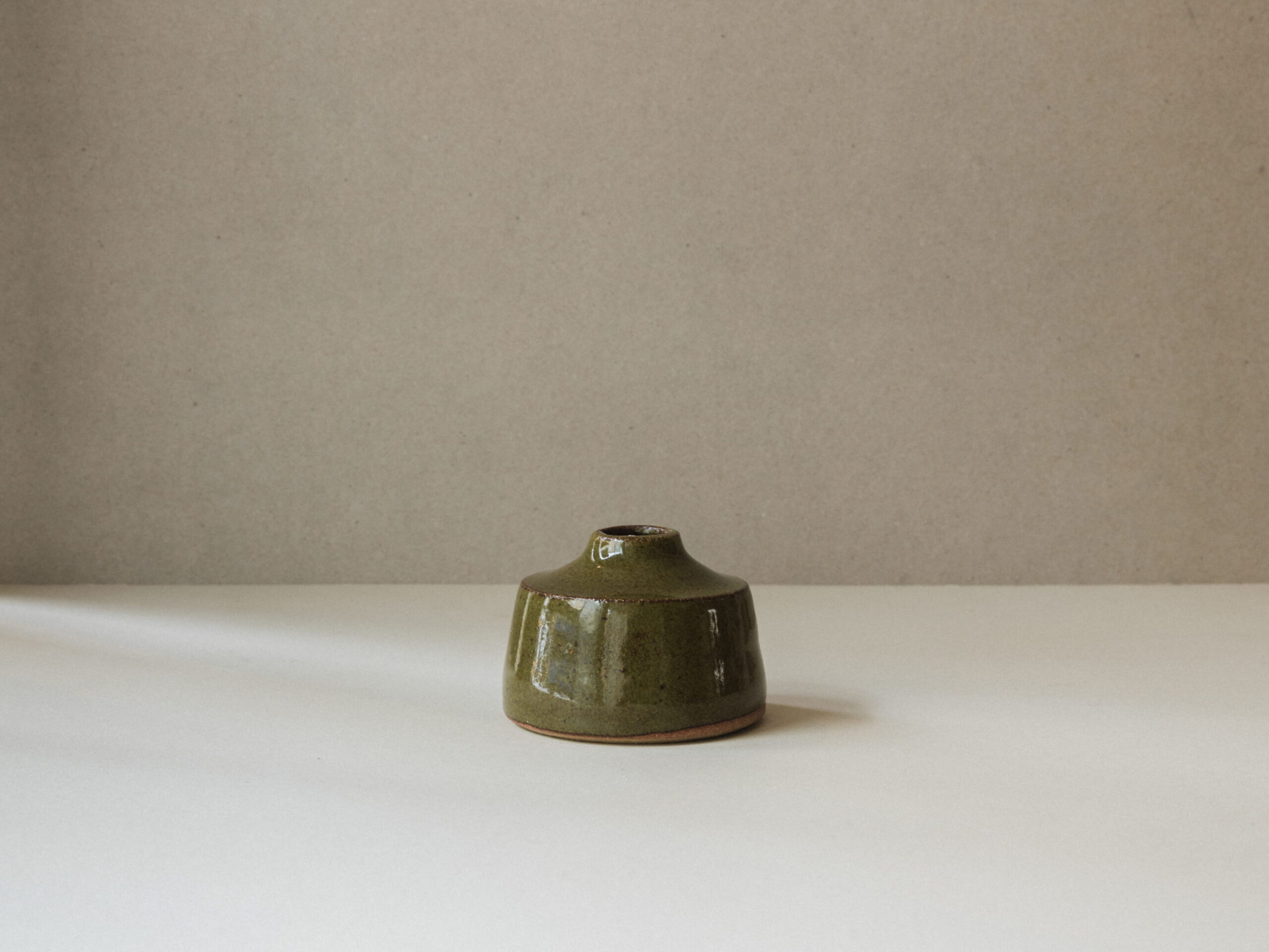 Hand-thrown stoneware bud vase or ink well in speckled olive glaze. Diameter of base 75mm, height 70mm. Made in Kent. Available to purchase with a pair of 100% British beeswax dining candles.