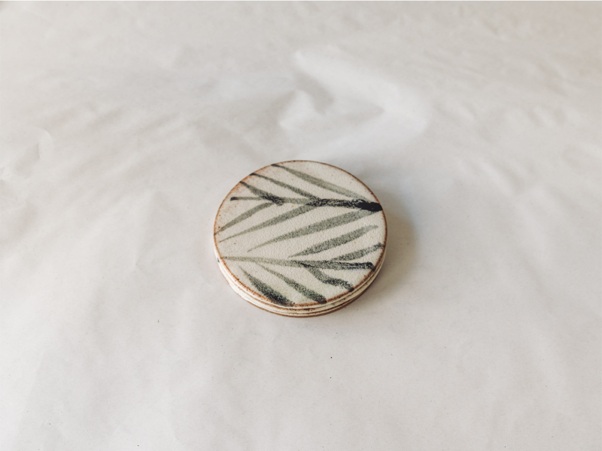 Hand-thrown stoneware coaster, hand-decorated with a traditional brush technique, and unglazed base. Diameter is approximately 102mm.