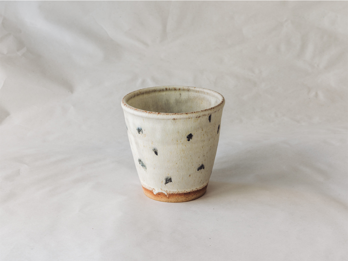 Hand-thrown stoneware beaker, with a loose white glazed interior and exterior, and an unglazed base. Approximately 85mm high x 100mm wide, handmade in East in London.