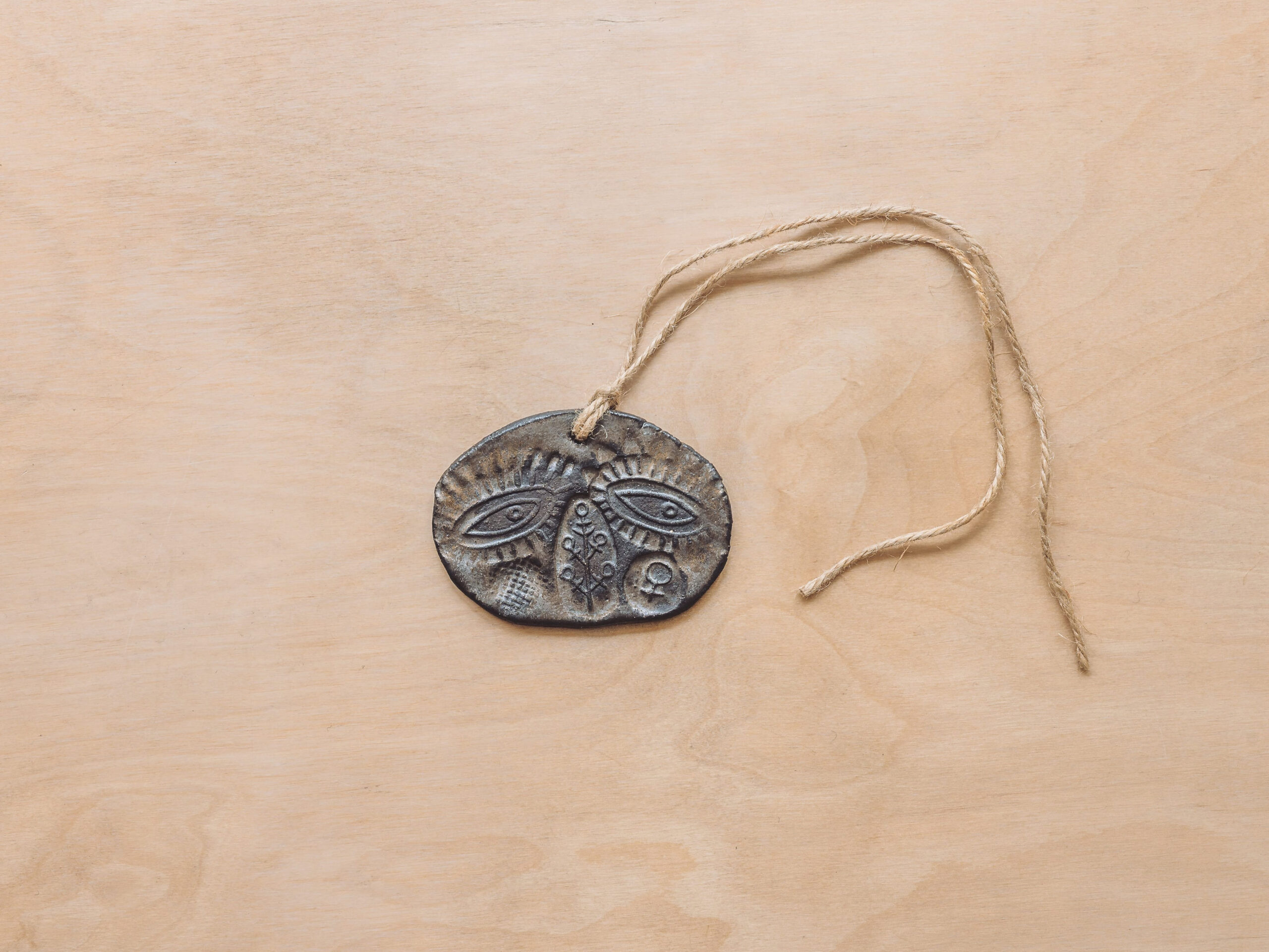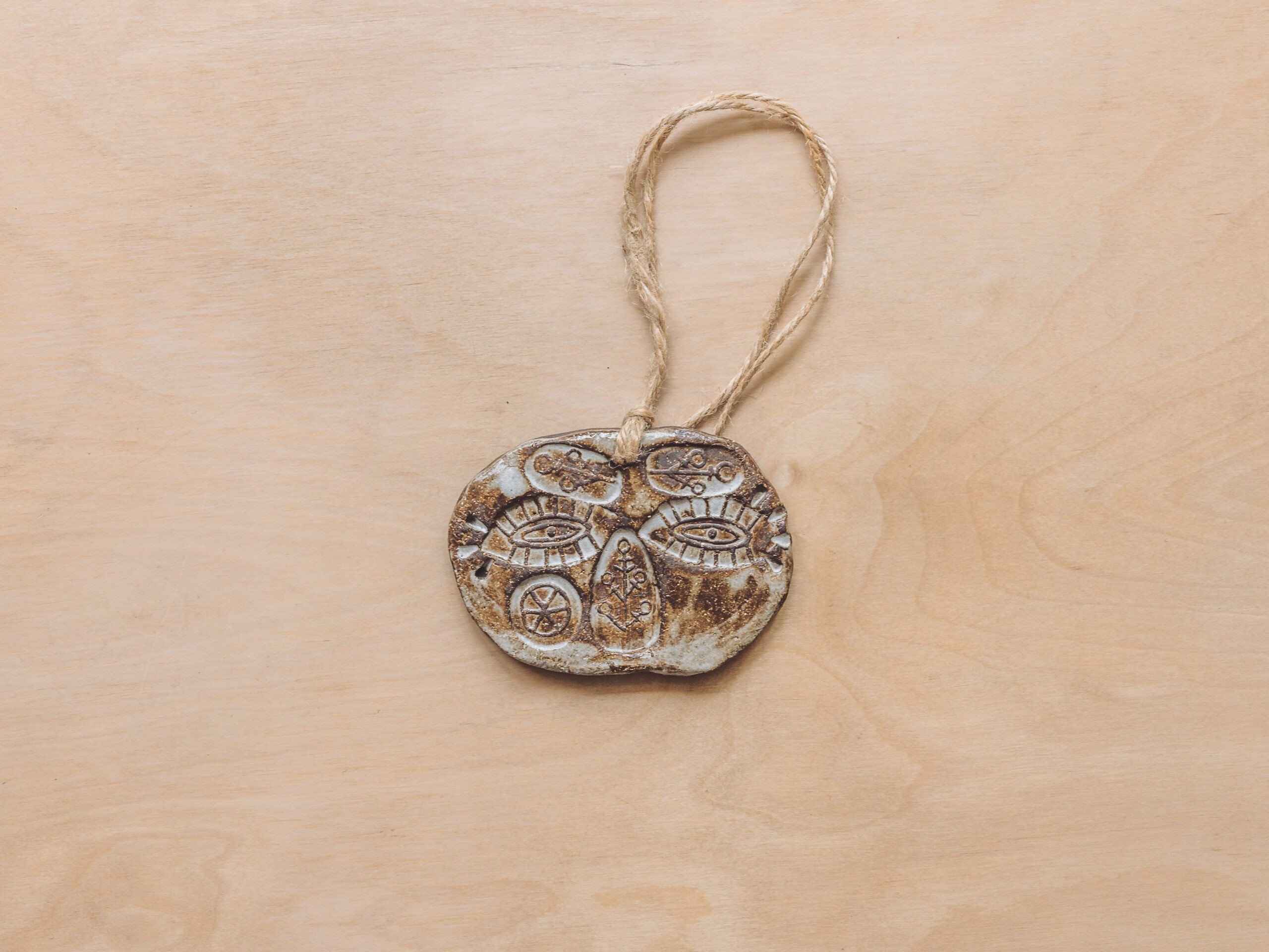 Unique hand-moulded and impressed glazed stoneware talismanic deity. Glazed stoneware, measuring approximately 95mm in width, 70mm across, with a pierced hole for hanging.