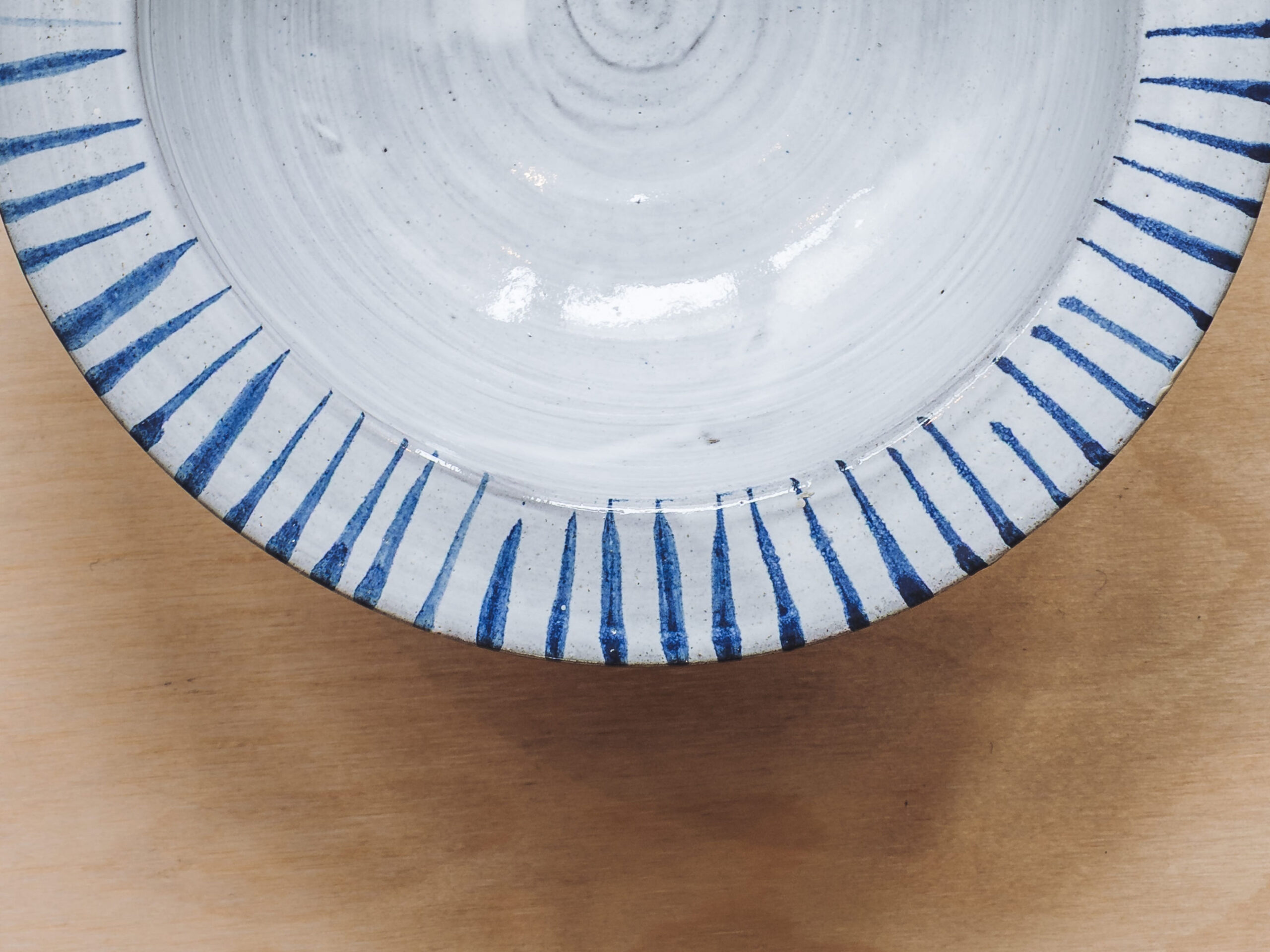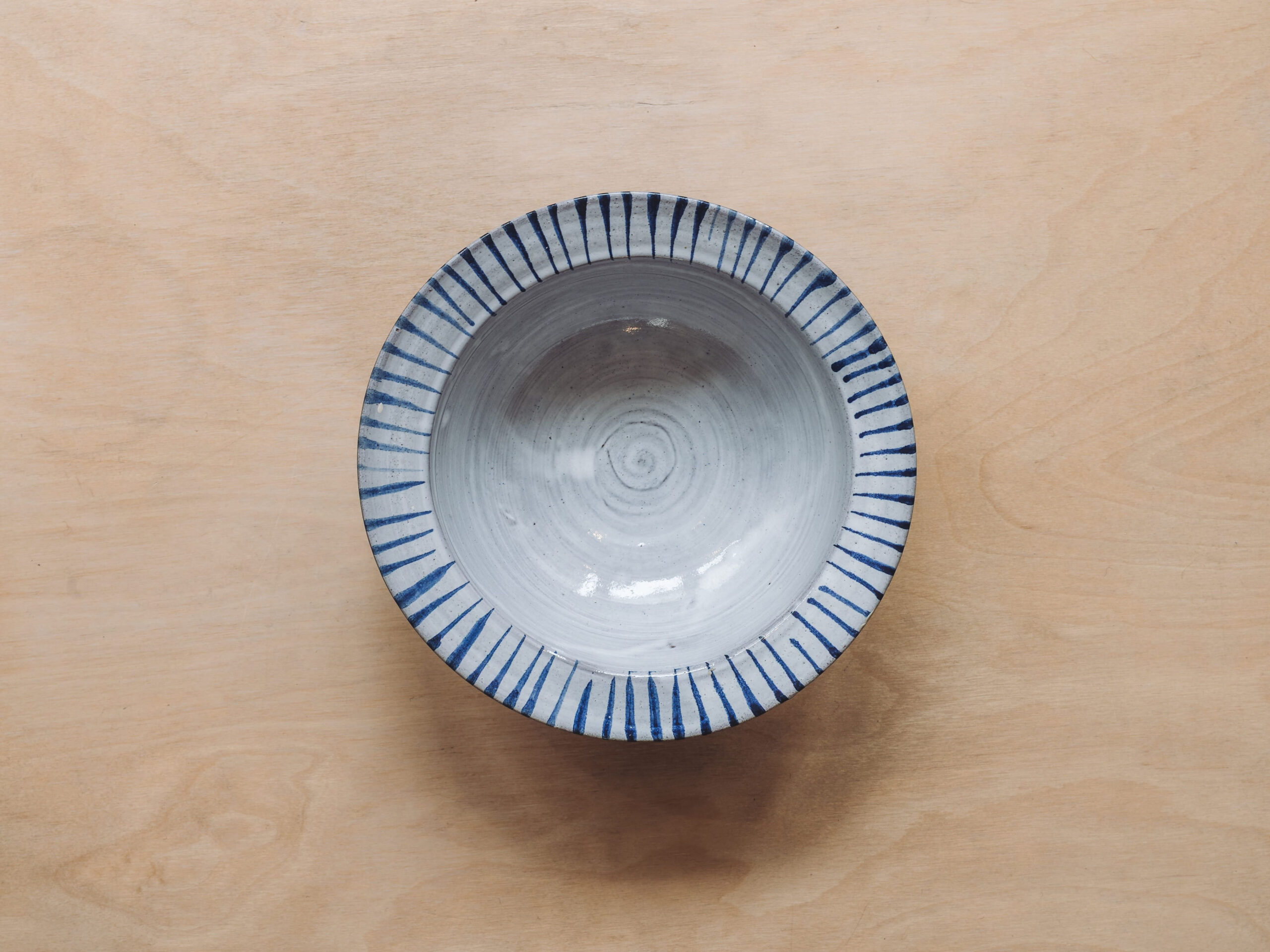 Terracotta earthenware bowl, fired with cobalt oxide over tin white glaze, measuring 190mm across, 70mm high.