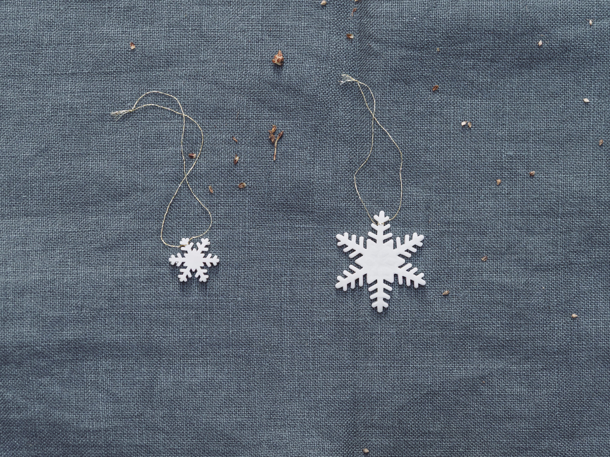 Handmade porcelain snowflakes, hung on metallic thread by Vicky Hageman.