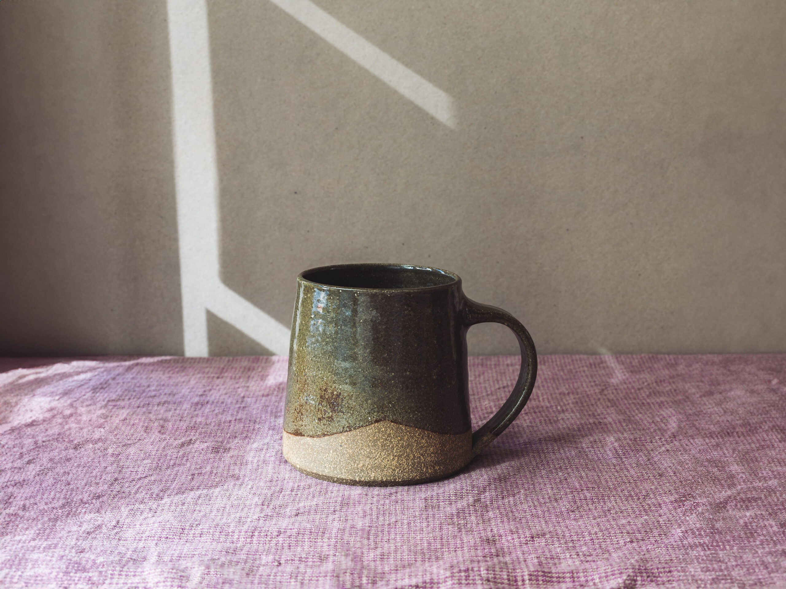 Hand-thrown stoneware cup with fully glazed interior. The dipped glaze shape will vary, with no two pieces being the same. Approximately 85mm wide x 100mm high, made in Kent.