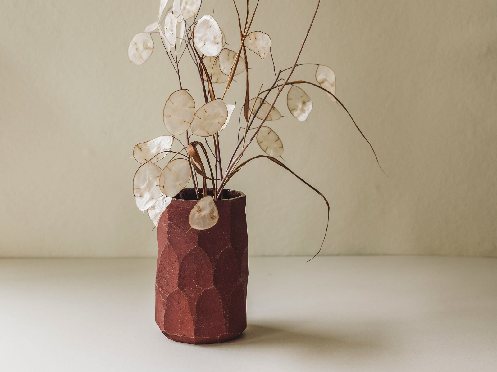Faceted vessel suited to a multitude of purposes: as a beaker, a vase or utensil holder. Grogged porcelain, wheel-thrown, unglazed and polished outside, transparent glaze on the inside. Measurements: 130mm in height, 75mm diameter.