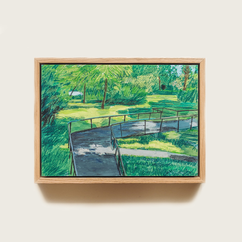 Original artwork in gouache and coloured pencil, presented in an oak tray frame. Artwork and frame measure 320mm wide, 230mm high and 25mm deep.
