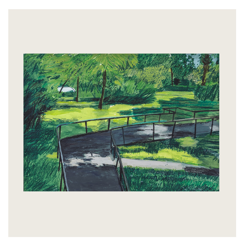 This painting is one of a series by the artist exploring Churchill Gardens in Pimlico; a housing estate built in 1947 as part of the Abercrombie Plan for London recreating housing after the bombing blitz of World War II. Churchill Gardens housed around 5000 people, and was the only tabled project from the Plan that was finally realised. It was a workable solution to a modern problem – relatively affordable housing.