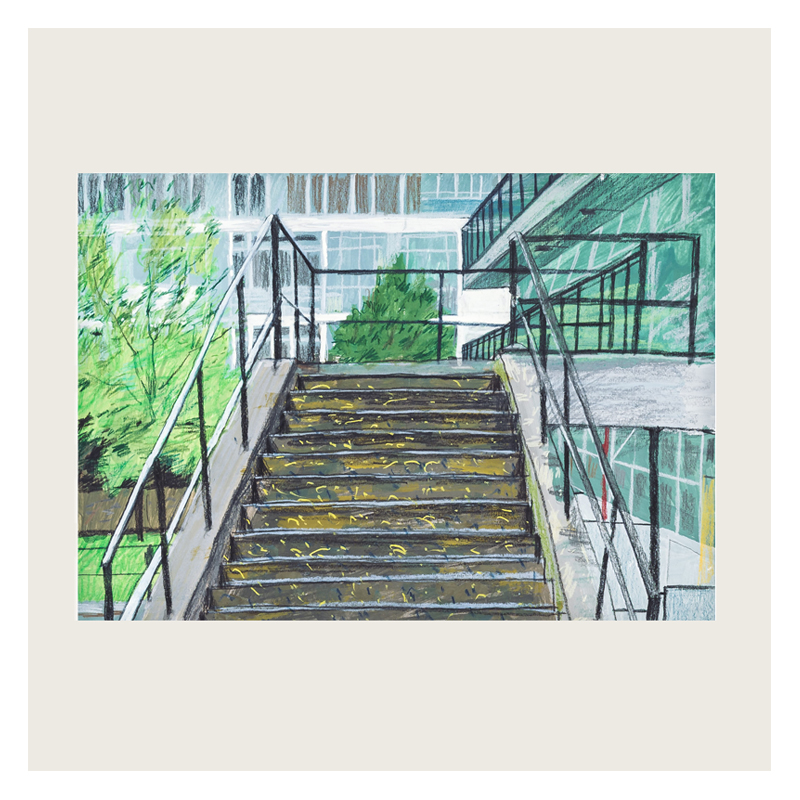 This painting is one of a series by the artist exploring Churchill Gardens in Pimlico; a housing estate built in 1947 as part of the Abercrombie Plan for London recreating housing after the bombing blitz of World War II. Churchill Gardens housed around 5000 people, and was the only tabled project from the Plan that was finally realised. It was a workable solution to a modern problem – relatively affordable housing.