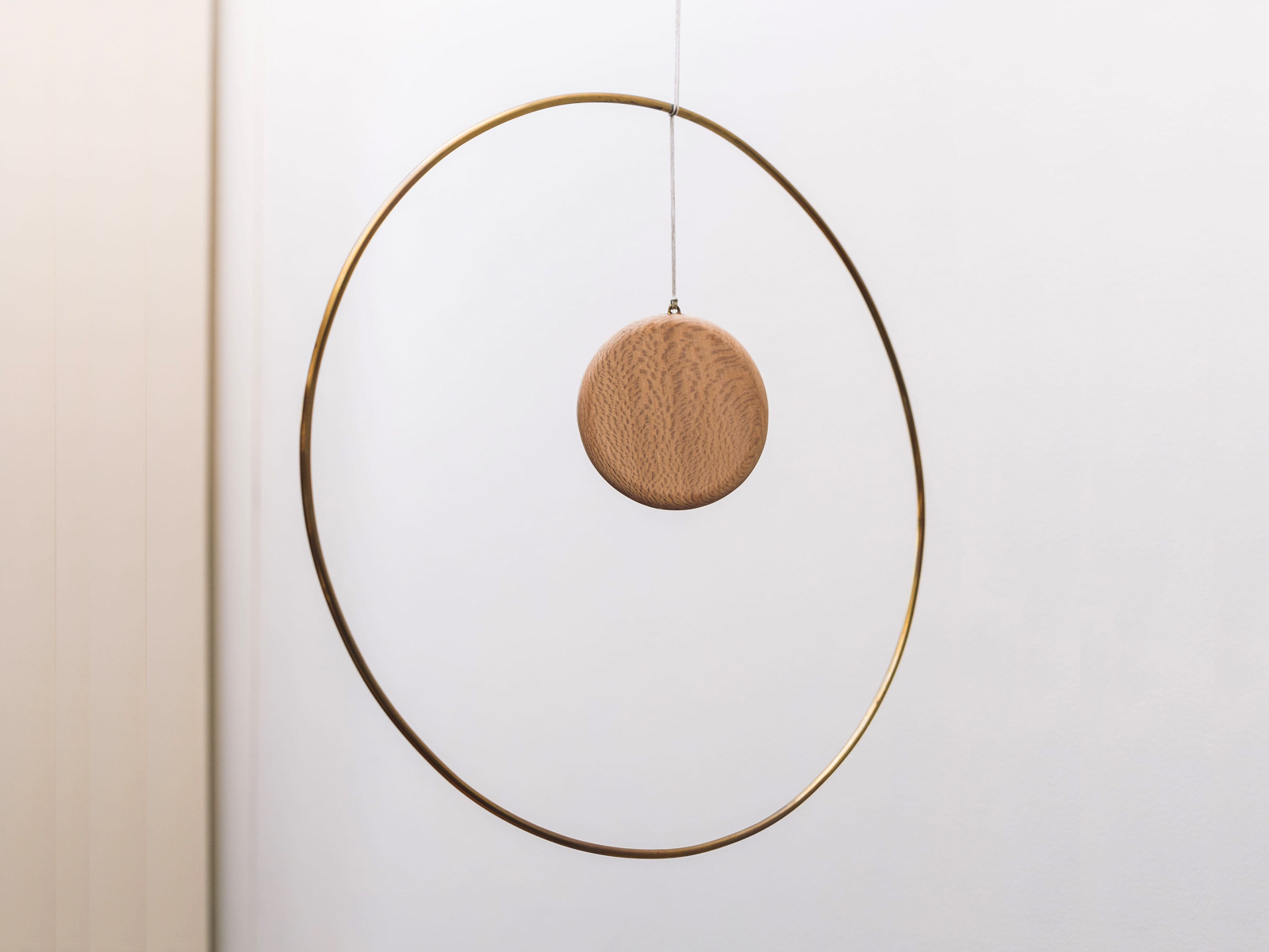 Single brass hoop with beautifully grained London plane wood suspended disc. The position of the wooden disc in relation to the brass hoop can be adjusted to personal preference.