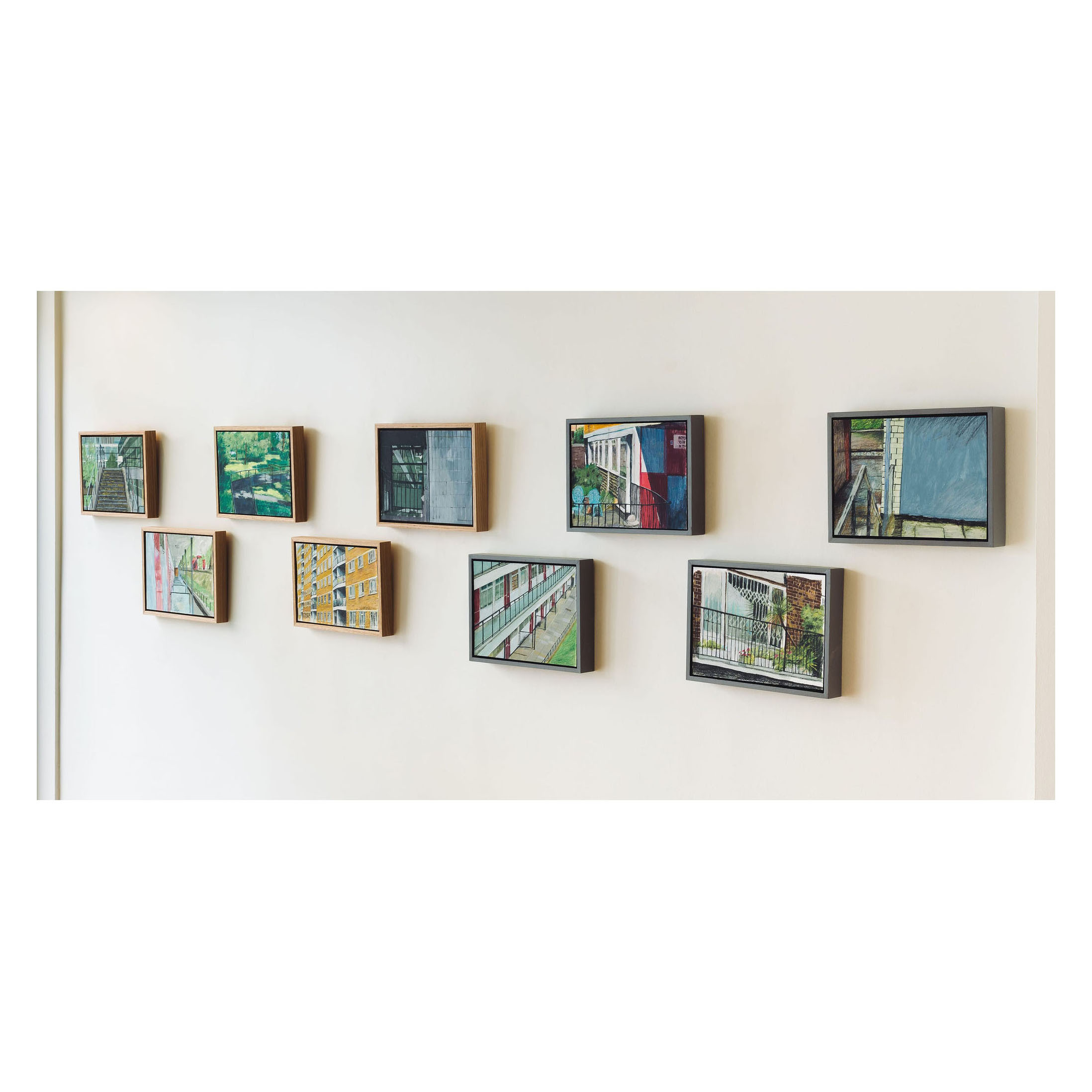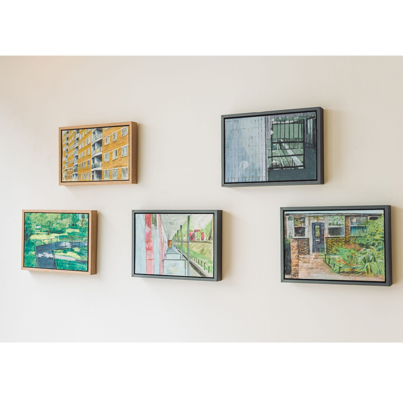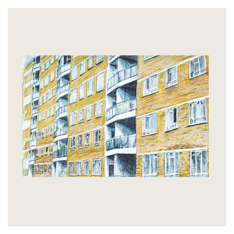 This painting is one of a series by the artist exploring Churchill Gardens in Pimlico; a housing estate built in 1947 as part of the Abercrombie Plan for London recreating housing after the bombing blitz of World War II. Churchill Gardens housed around 5000 people, and was the only tabled project from the Plan that was finally realised. It was a workable solution to a modern problem – relatively affordable housing.