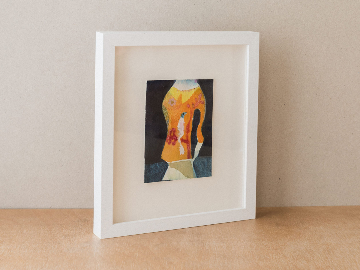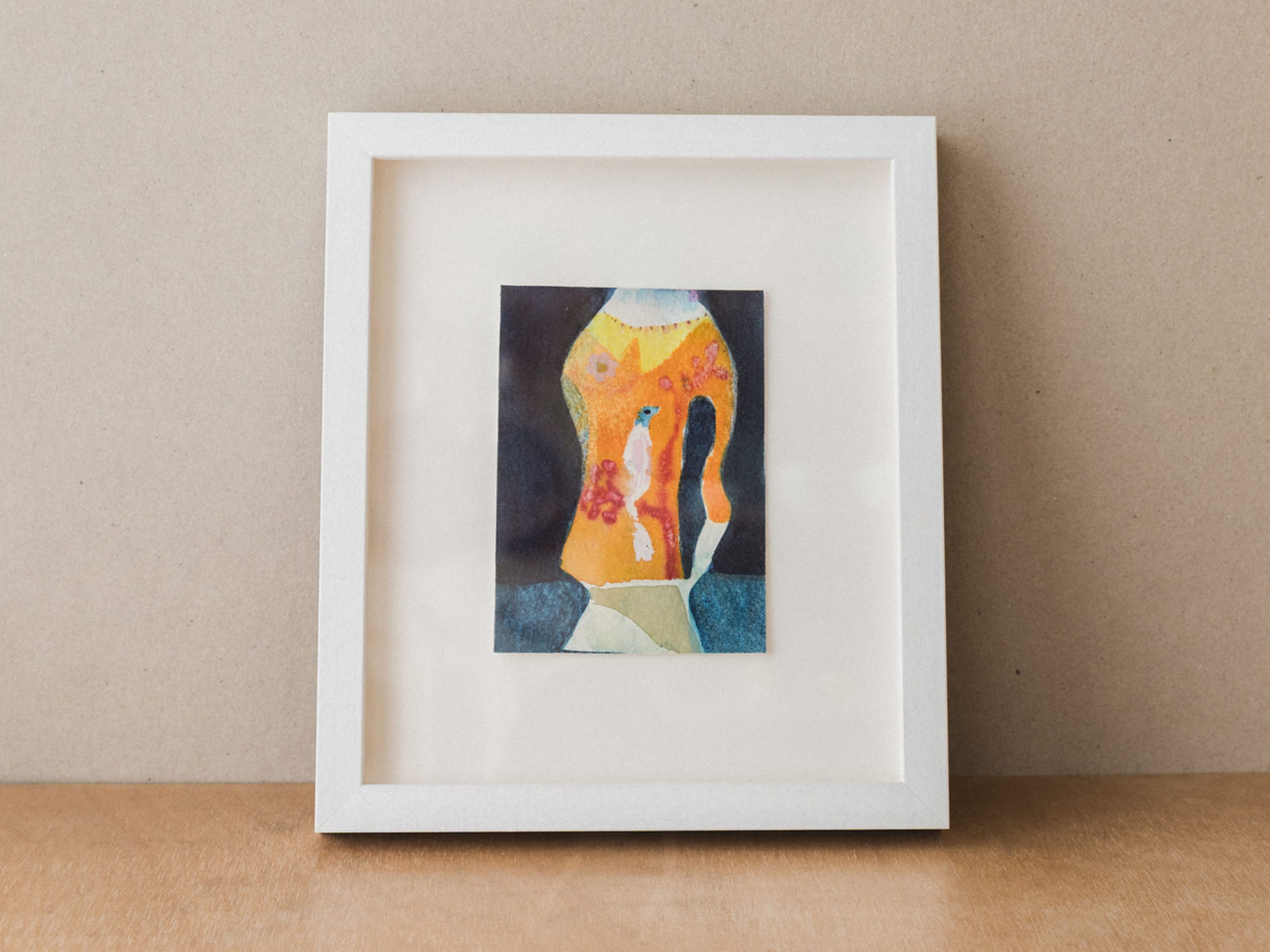 Original watercolour, signed on reverse, float-mounted, framed and glazed. Artwork size 86mm wide x 120mm high, frame size 195mm wide x 230mm high x 25mm deep.