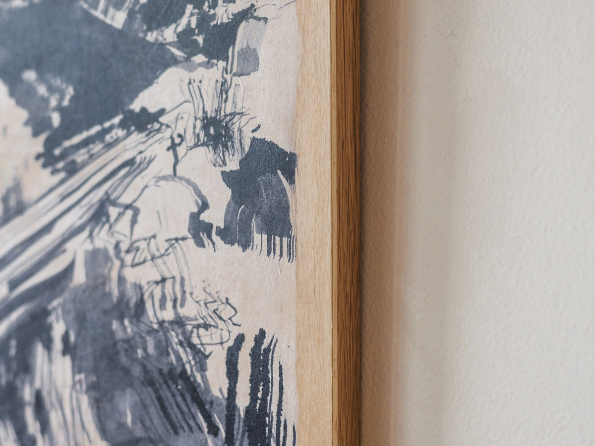 Original ink and brush drawing on Japanese paper, treated with archival anti-UV spray and finished with layers of polished cold wax on cradled plywood panel. Fi likes the idea that her paintings can exist as objects without additional glass and framing.