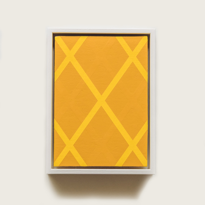 Acrylic on canvas, framed with an unglazed tray frame in solid wood, painted white. Frame measures 150mm wide x 200mm high and 35mm deep.