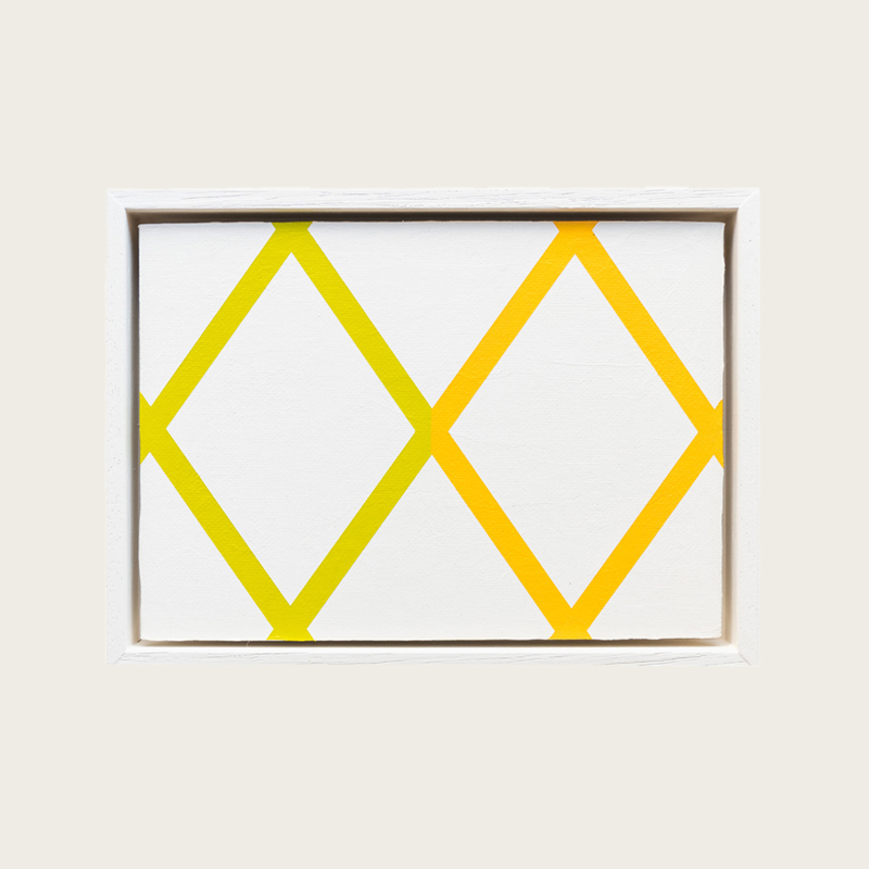 Acrylic on canvas, framed with an unglazed tray frame in solid wood, painted white. Frame measures 200mm wide x 150mm high and 35mm deep.
