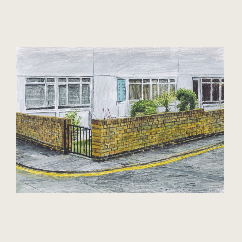 This painting is one of a series by the artist exploring Churchill Gardens in Pimlico; a housing estate built in 1947 as part of the Abercrombie Plan for London recreating housing after the bombing blitz of World War II. Churchill Gardens housed around 5000 people, and was the only tabled project from the Plan that was finally realised. It was a workable solution to a modern problem – relatively affordable housing.