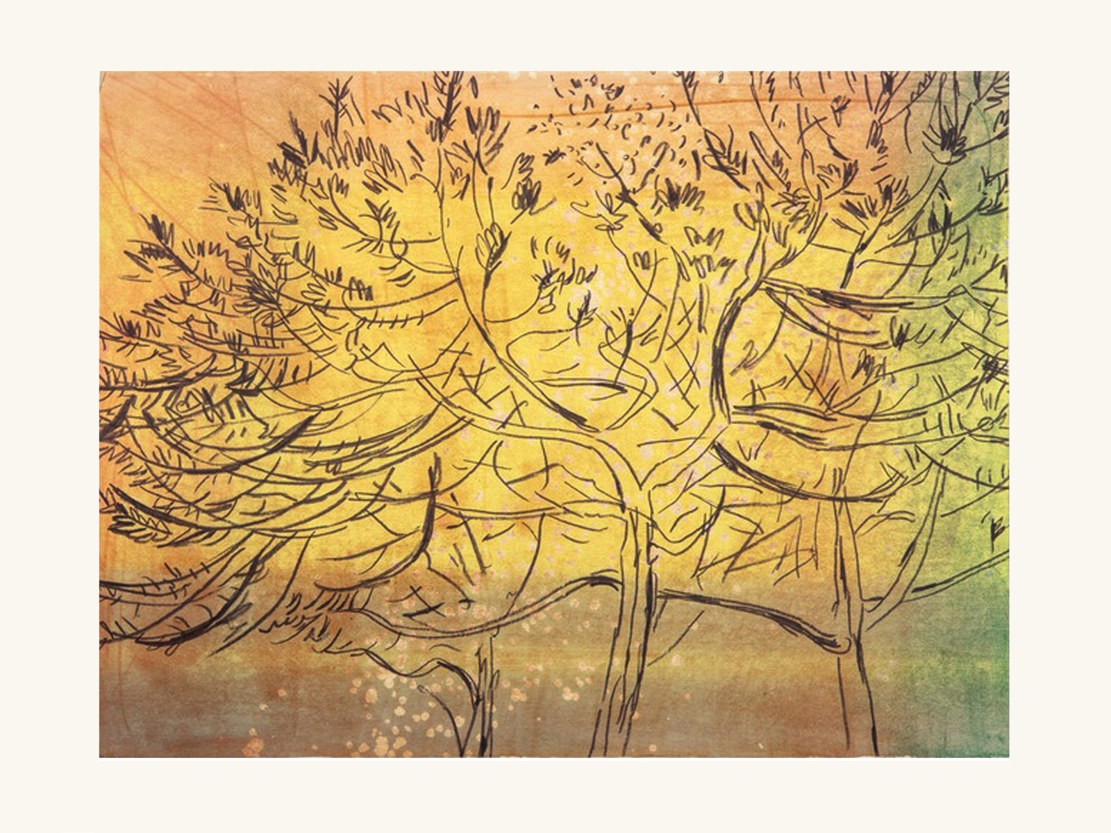 Woodblock monoprint with the line work screen printed on top. The image is printed edge to edge on Kitakata 31gsm Japanese handmade paper. Signed, variable limited edition of 40, size 550mm x 415mm.