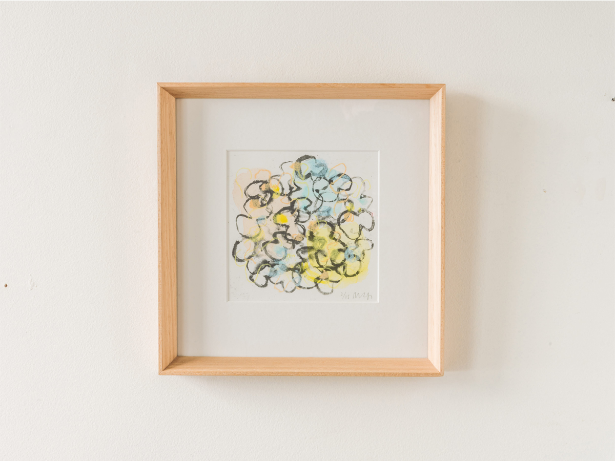 Screenprint with watercolour and pastel, signed and numbered 2/15, window-mounted in a bevelled-edge wood frame. Window size 130 x 130mm, frame size 245 x 250mm. Unframed version also available in window mount, signed and numbered 3/15, measuring 230 x 235mm. Hand-finished variable edition of 15.