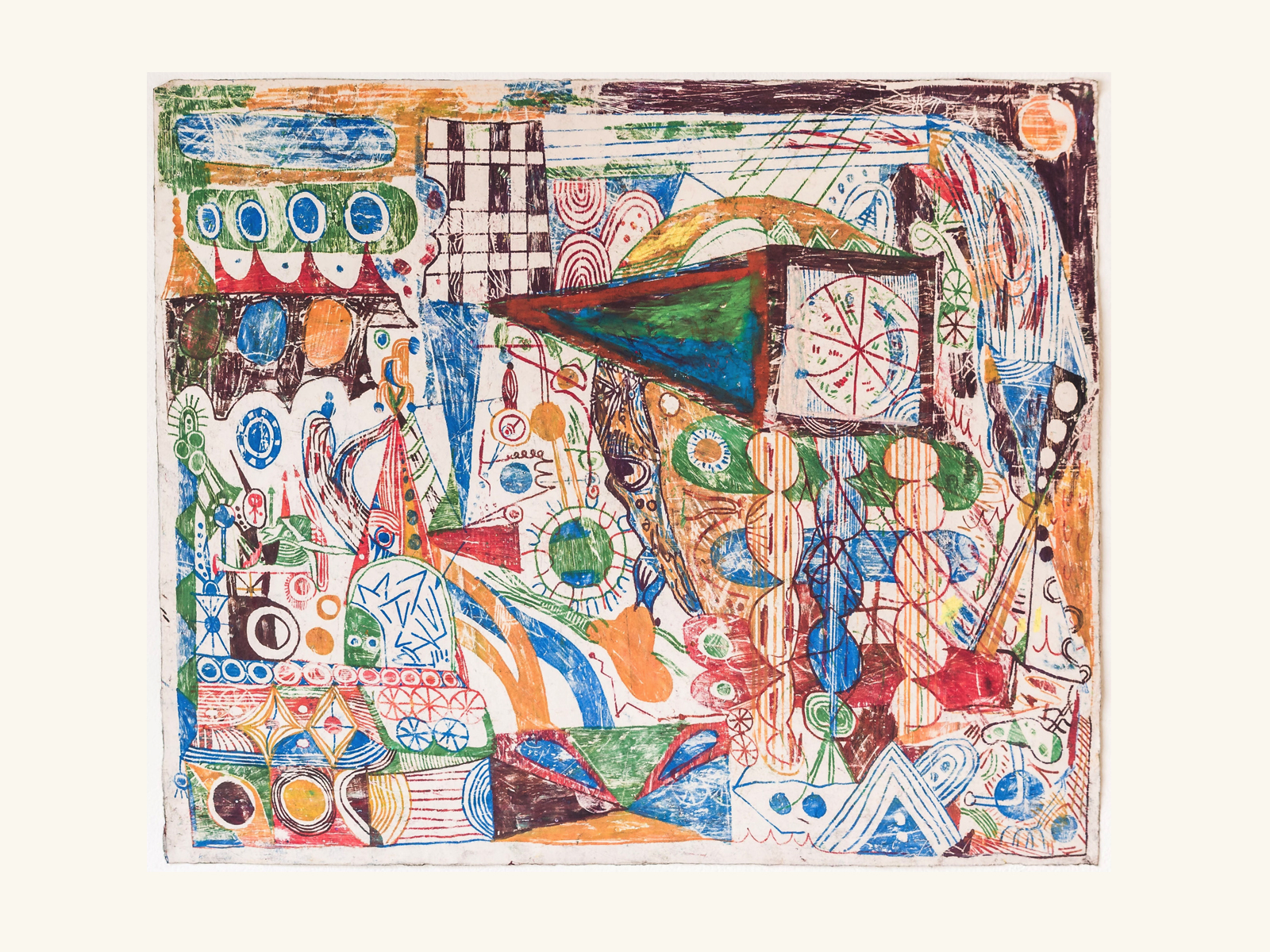 Monoprint (with the drawing on the reverse of the paper) using oil-based pastels on Kitakata 110gsm handmade Japanese paper with a deckle edge. Size 520 x 440mm.