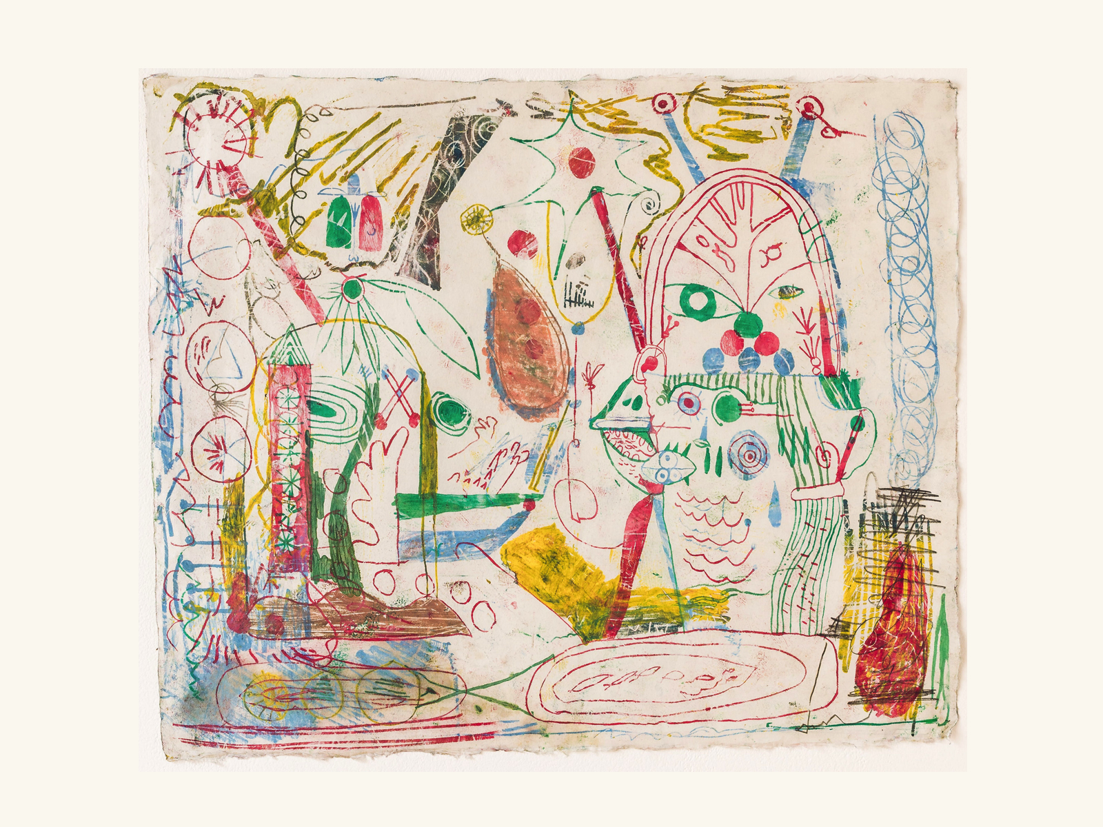 Monoprint (with the drawing on the reverse of the paper) using oil-based pastels on Kitakata 110gsm handmade Japanese paper with a deckle edge. Size 520 x 440mm.