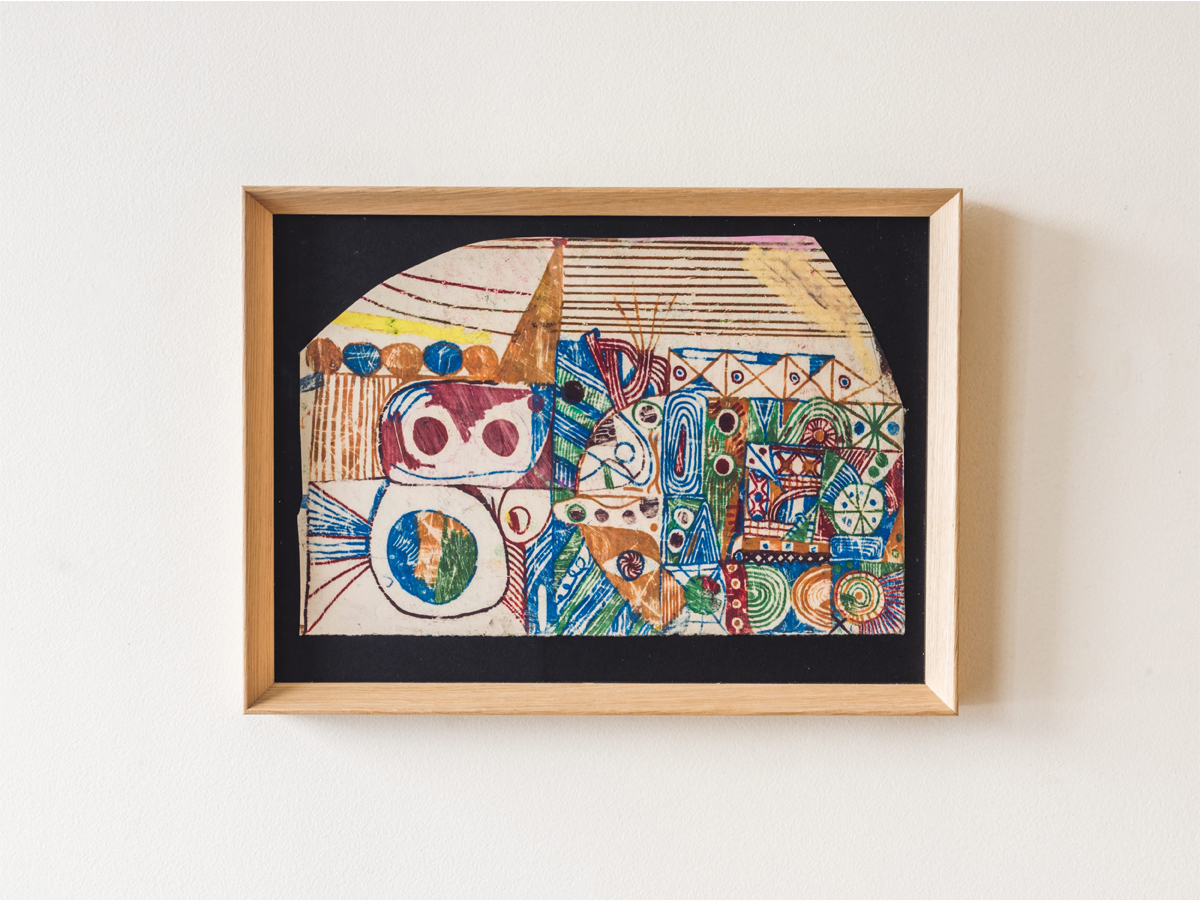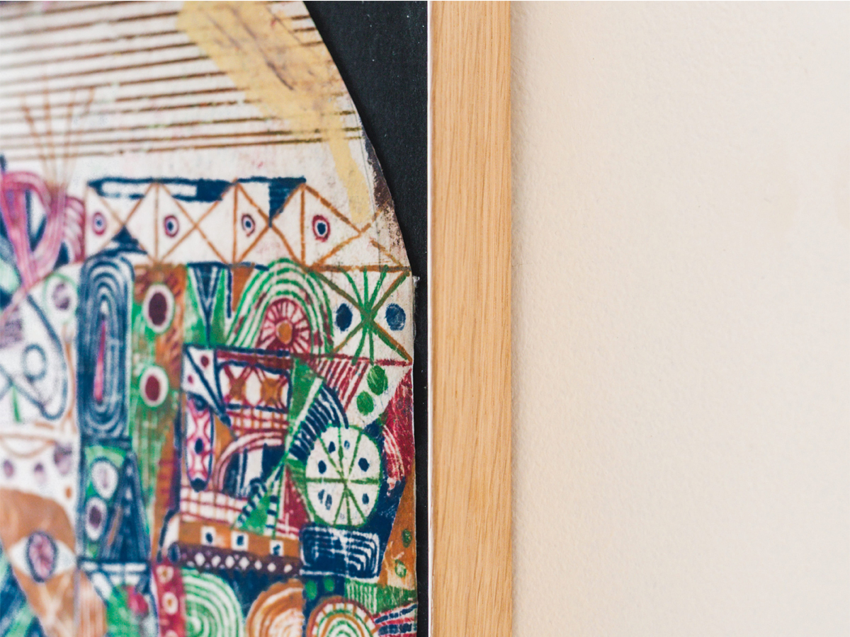 Monoprint (with the drawing on the reverse of the paper) using oil-based pastels on Kitakata 110gsm handmade Japanese paper with a deckle edge. Framed in a bevelled-edge oak frame, mounted and glazed, artwork size 305mm wide x 200mm tall, frame size 350mm wide x 255mm tall x 30mm deep.