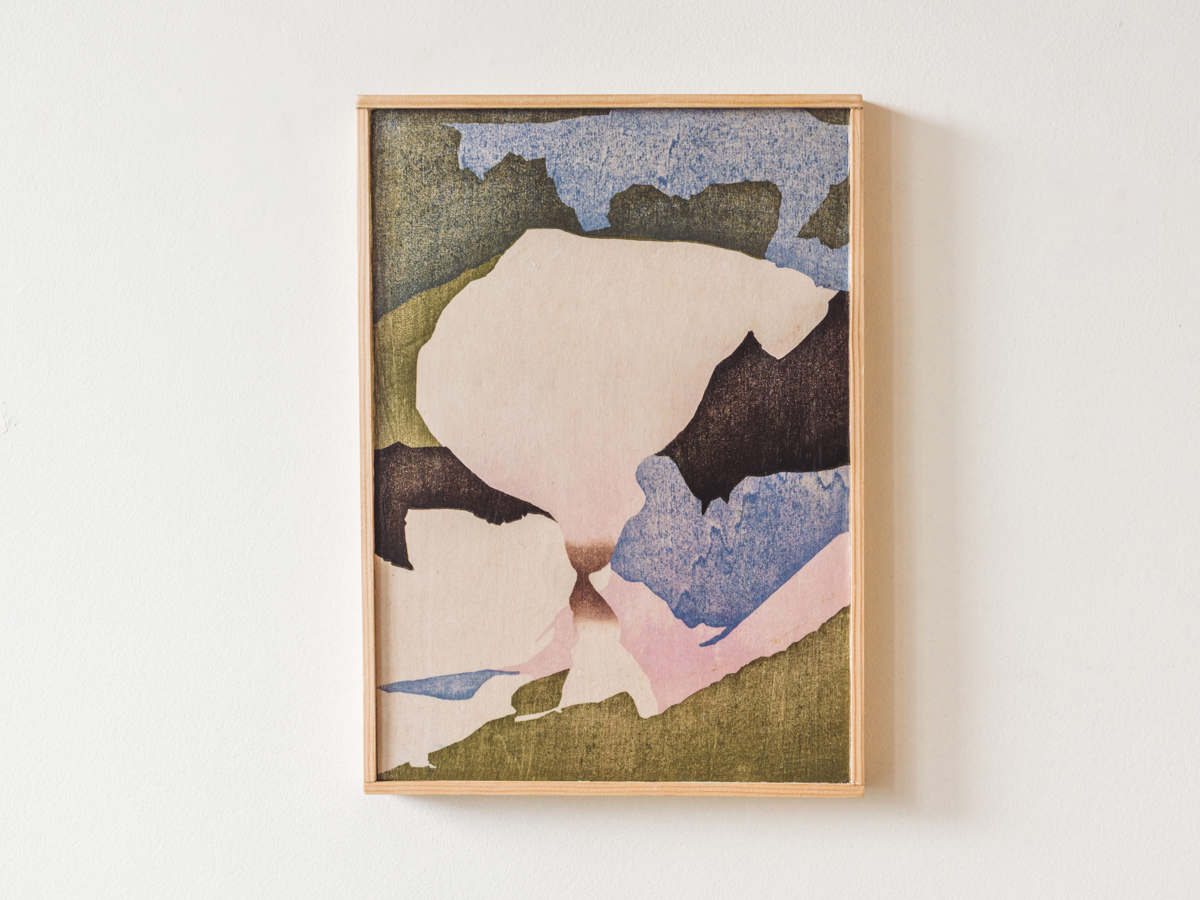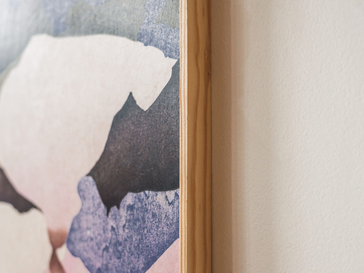 Mokuhanga (Japanese woodblock print), treated with archival anti-UV spray and finished with layers of polished cold wax on plywood panel. Fi likes the idea that her prints can exist as objects without additional glass and framing.