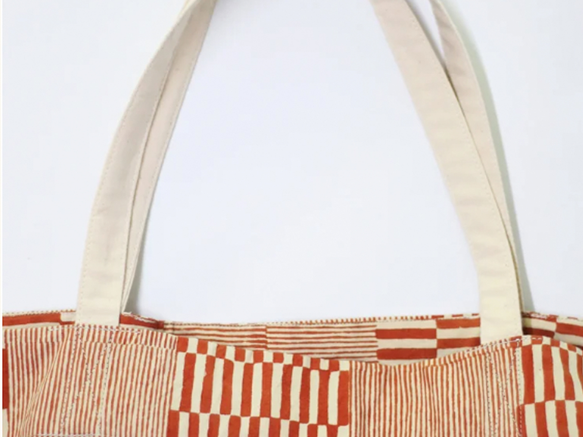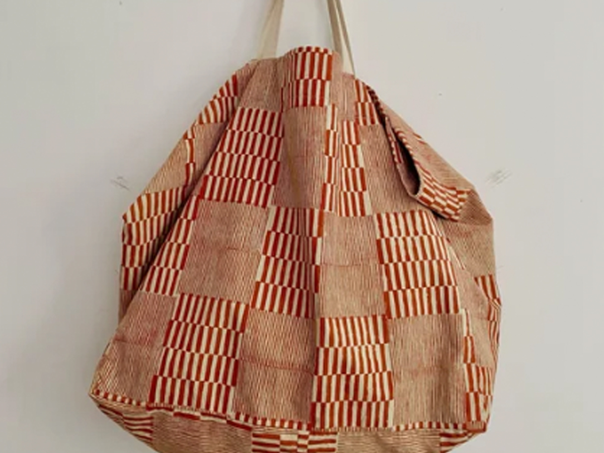 Large tote bag designed and made by Louisa Loakes. This bag was hand block printed in India using natural dyes from the root of the Madder plant.
