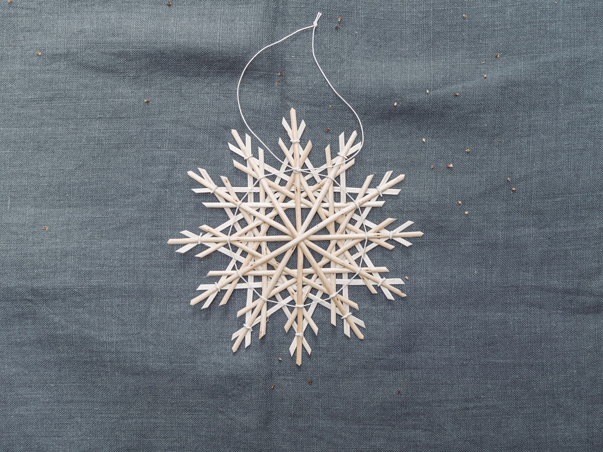 The rods are then cleaved into three pieces with a knife, and the centre shaved off – a process known as skeining.  Each rod is then cut into the relevant length, the star is woven using a small jig, tied and trimmed.
