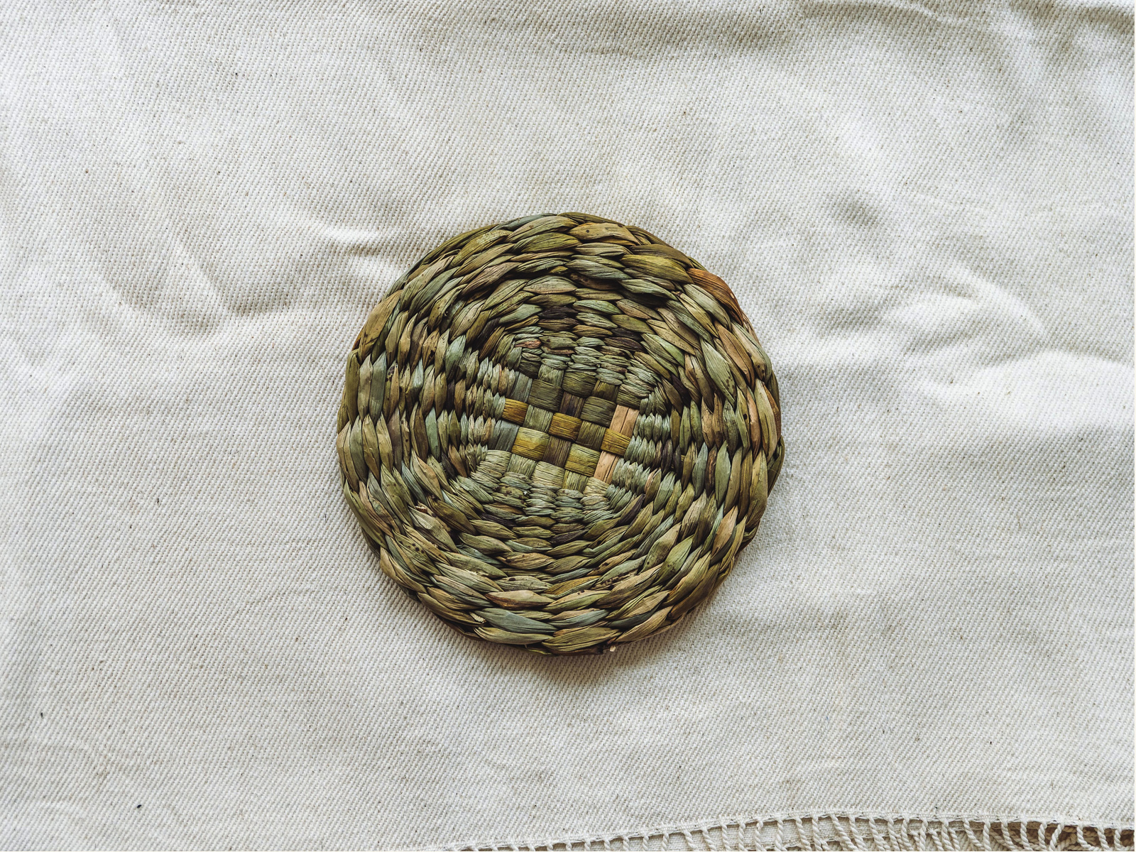Plaited and woven in English bulrush, which has been harvested from punts on the river Ouse and Nene in the UK. Colours of rush work may vary, likely being green to start, then mellowing to golden honey tones as they age. Measures 20cm in diameter.
