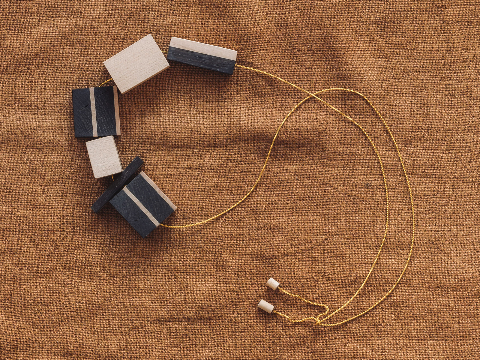 Geometric form bead necklace by Corrie Williamson. Each bead of natural, undyed wood is hand-carved from London Plane and Bog Oak, layers of which are sandwiched together to create striped beads. Bog Oak has a patina that naturally blackens over time. Strung on silk thread with a 380mm drop. Handmade in London.
